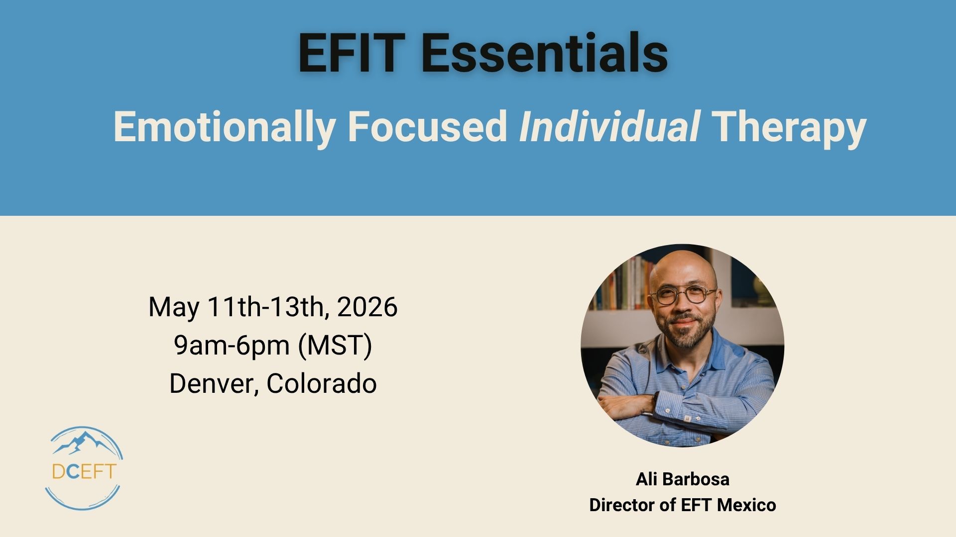 The Denver EFT Community is excited to be hosting their first Emotionally Focused Individual Therapy (EFIT) Essentials endorsed by the International Centre for Excellence in Emotionally Focused Therapy (ICEEFT). Ali Barbosa is a licensed Marriage and Family Therapist and a Certified Emotionally Focused Therapy (EFT) Therapist, Supervisor, and Trainer. He serves as a member of the ICEEFT Board and is the Director of EFT México, the first ICEEFT-affiliated center in Latin America.